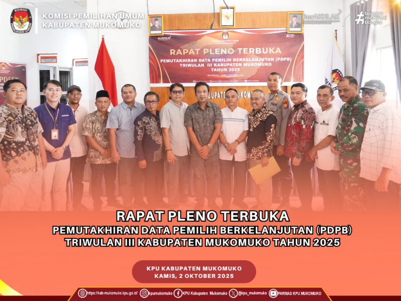 #TemanPemilih KPU Kabupaten Mukomuko melaksanakan Rapat Pleno Terbuka Pemutakhiran Data Pemilih Berkelanjutan (PDPB) Triwulan III Kabupaten Mukomuko bertempat di Aula Kantor KPU Kabupaten Mukomuko (Kamis, 2 Oktober 2025).