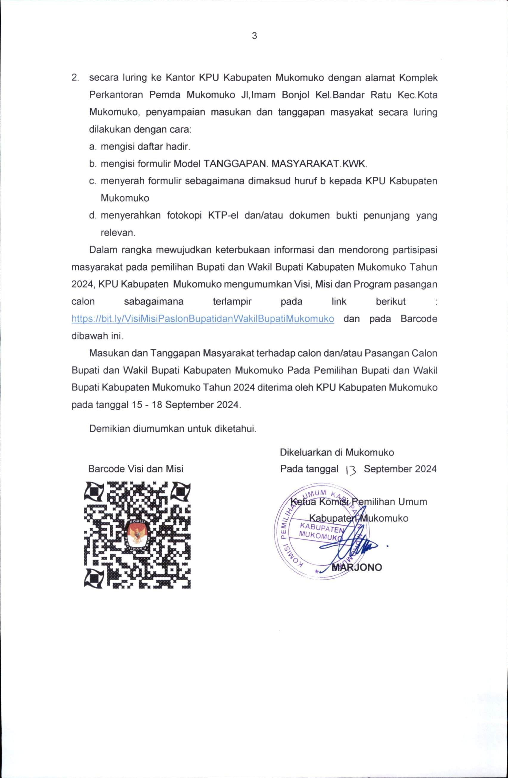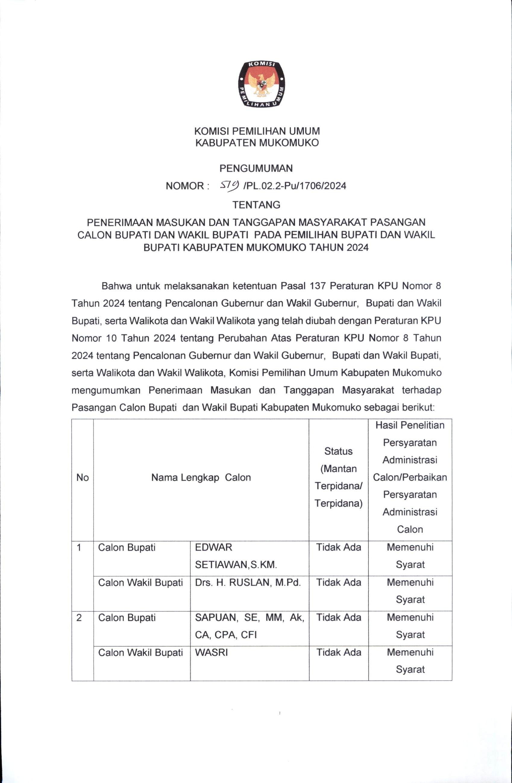 Pengumuman Penerimaan Masukan dan Tanggapan Masyarakat Pasangan Calon Bupati dan Wakil Bupati Pada Pemilihan Bupati dan Wakil Bupati Kabupaten Mukomuko Tahun 2024