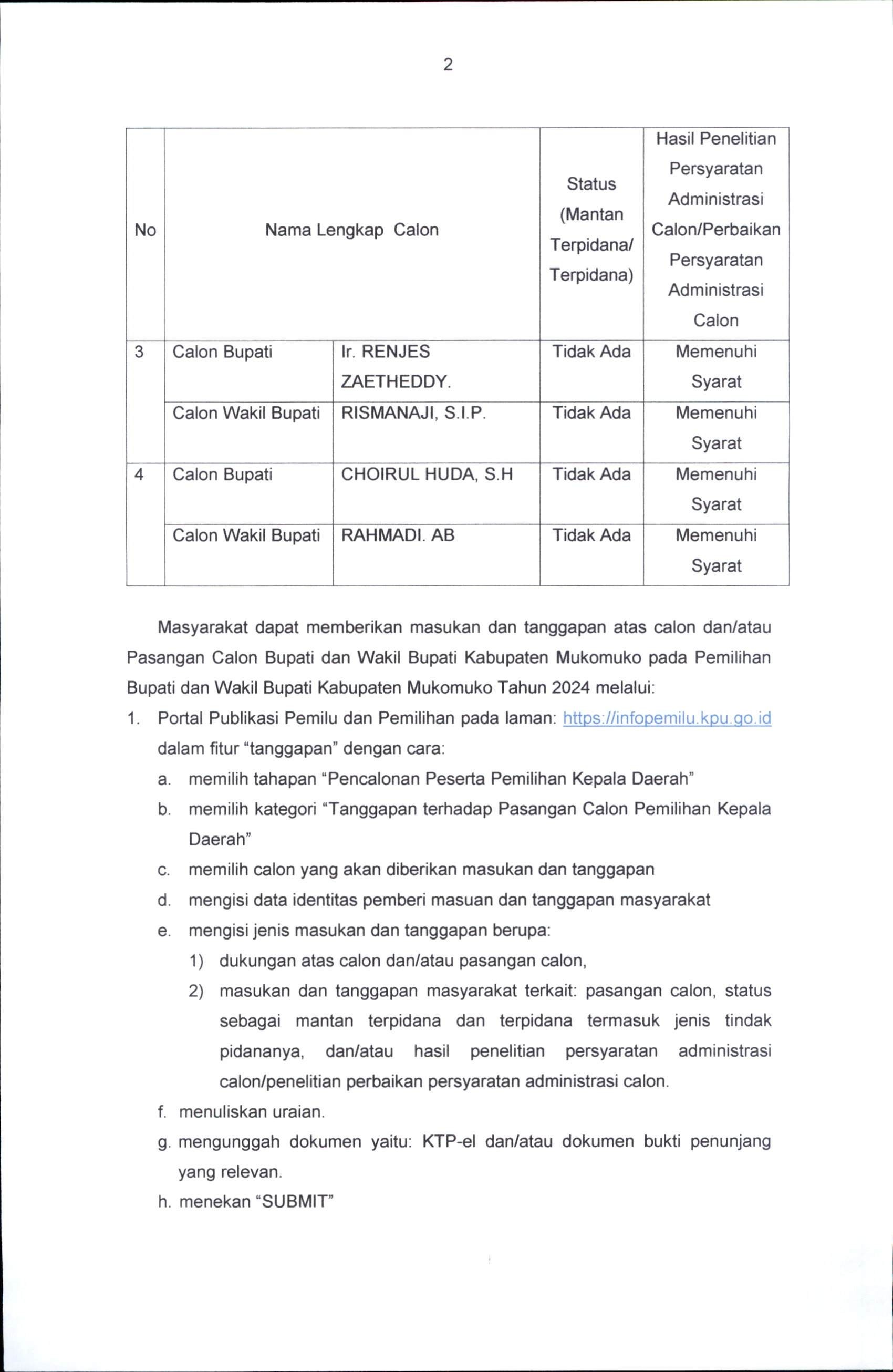 KPU Kabupaten Mukomuko Mengumuman Penerimaan Masukan dan Tanggapan Masyarakat Pasangan Calon Bupati dan Wakil Bupati Pada Pemilihan Bupati dan Wakil Bupati Kabupaten Mukomuko Tahun 2024 terhadap Pasangan Calon Bupati dan Wakil Bupati Mukomuko sebagaimana di umumkan di bawah ini: