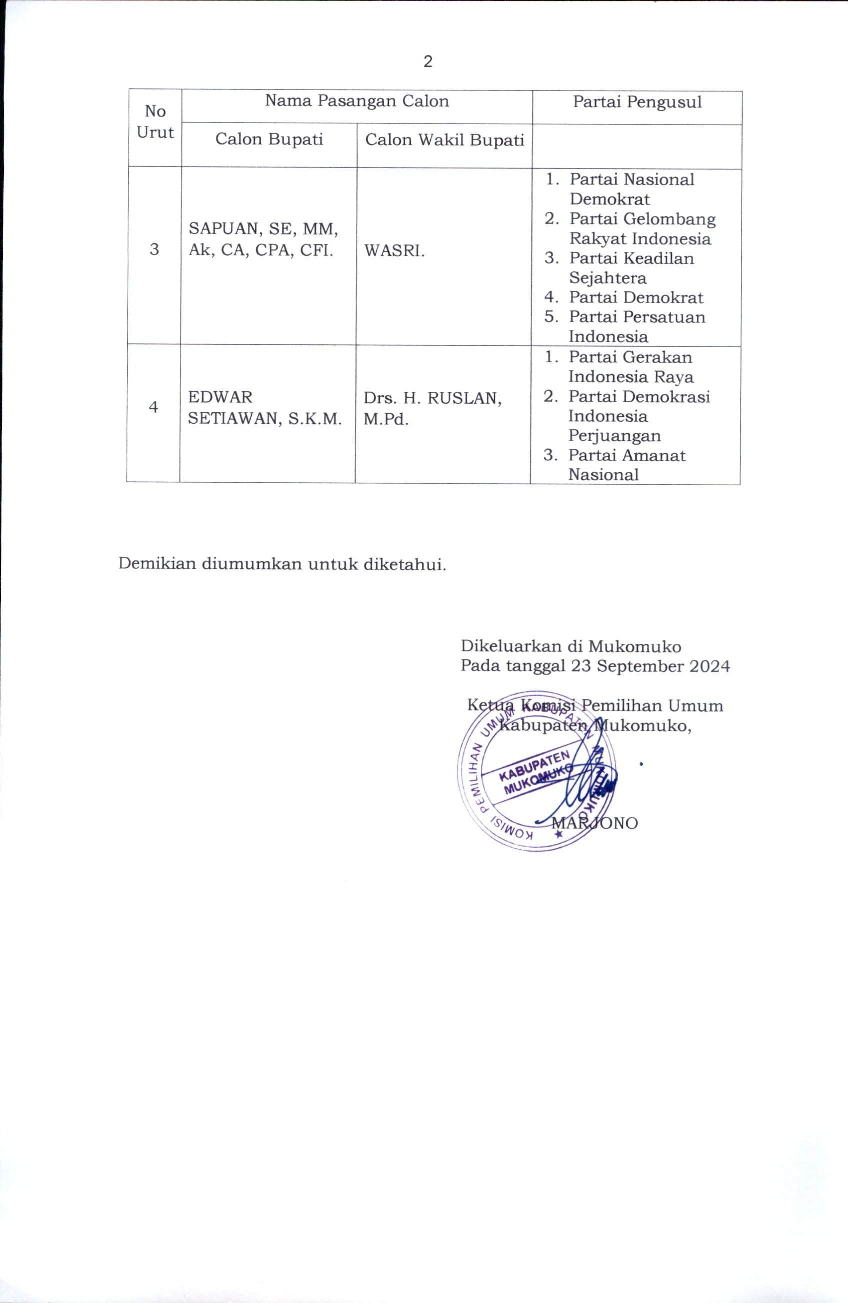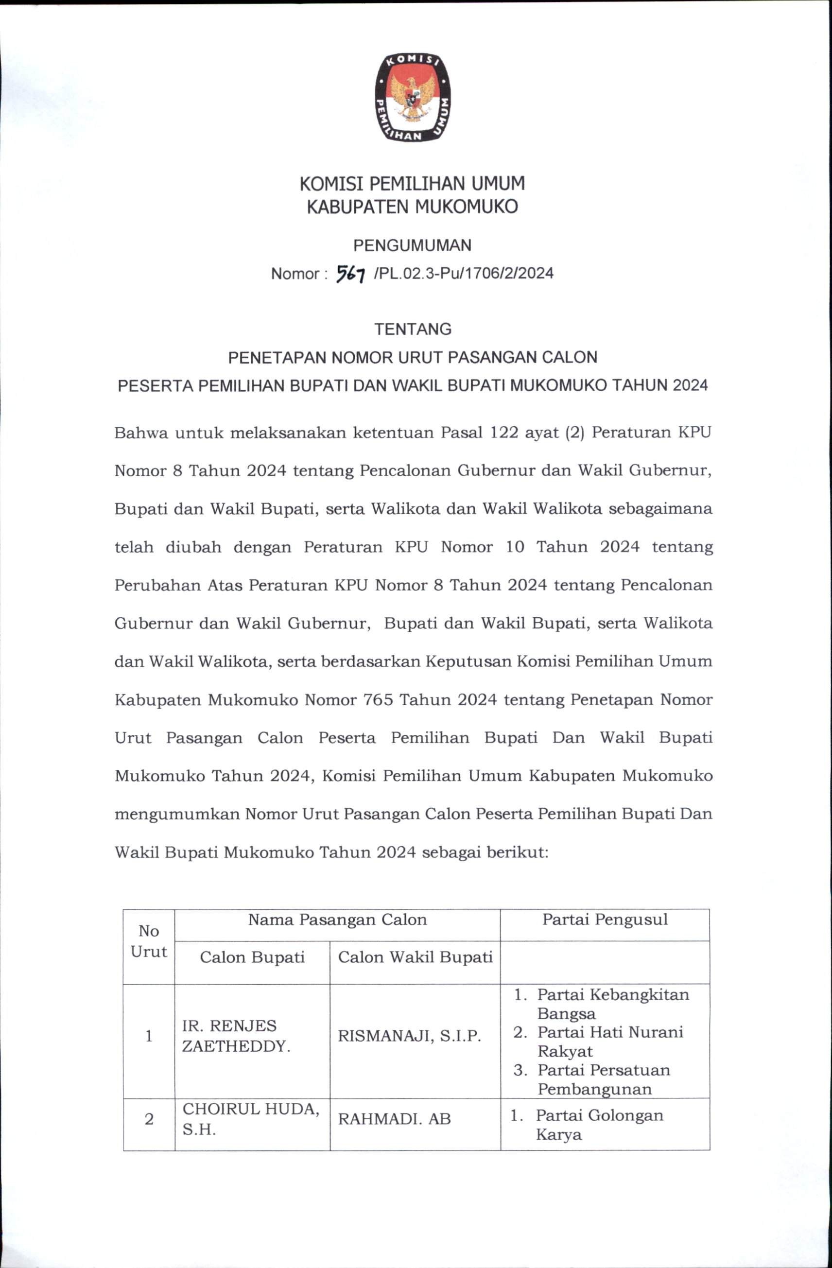 Pengumuman Penetapan Nomor Urut Pasangan Calon Peserta Pemilihan Bupati dan Wakil Bupati Mukomuko Tahun 2024 dapat di lihat di bawah ini: