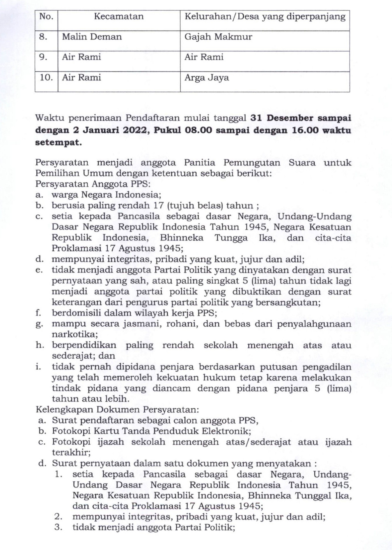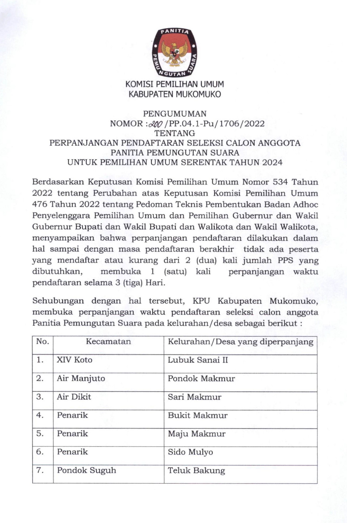 PENGUMUMAN PERPANJANGAN PENDAFTARAN SELEKSI CALON ANGGOTA PANITIA PEMUNGUTAN SUARA (PPS) UNTUK PEMILU SERENTAK TAHUN 2024 DAPAT DI DOWNLOAD DAN DI LIHAT DI BAWAH INI:
