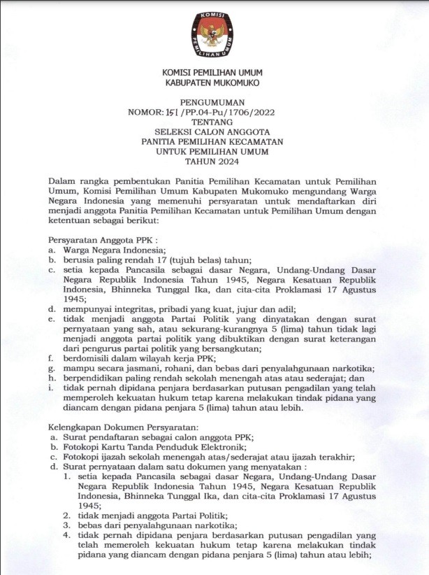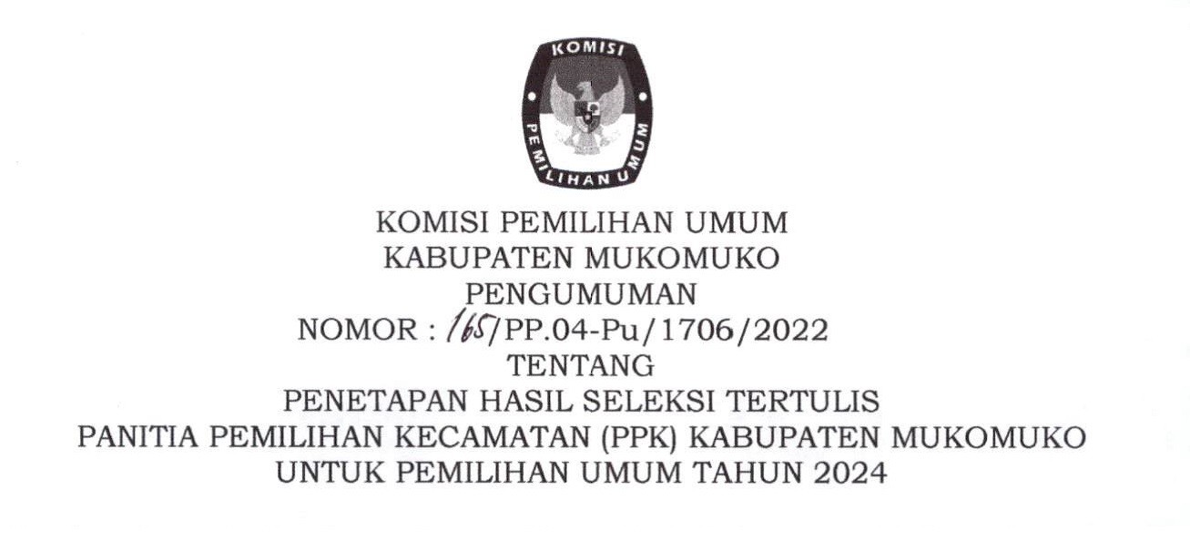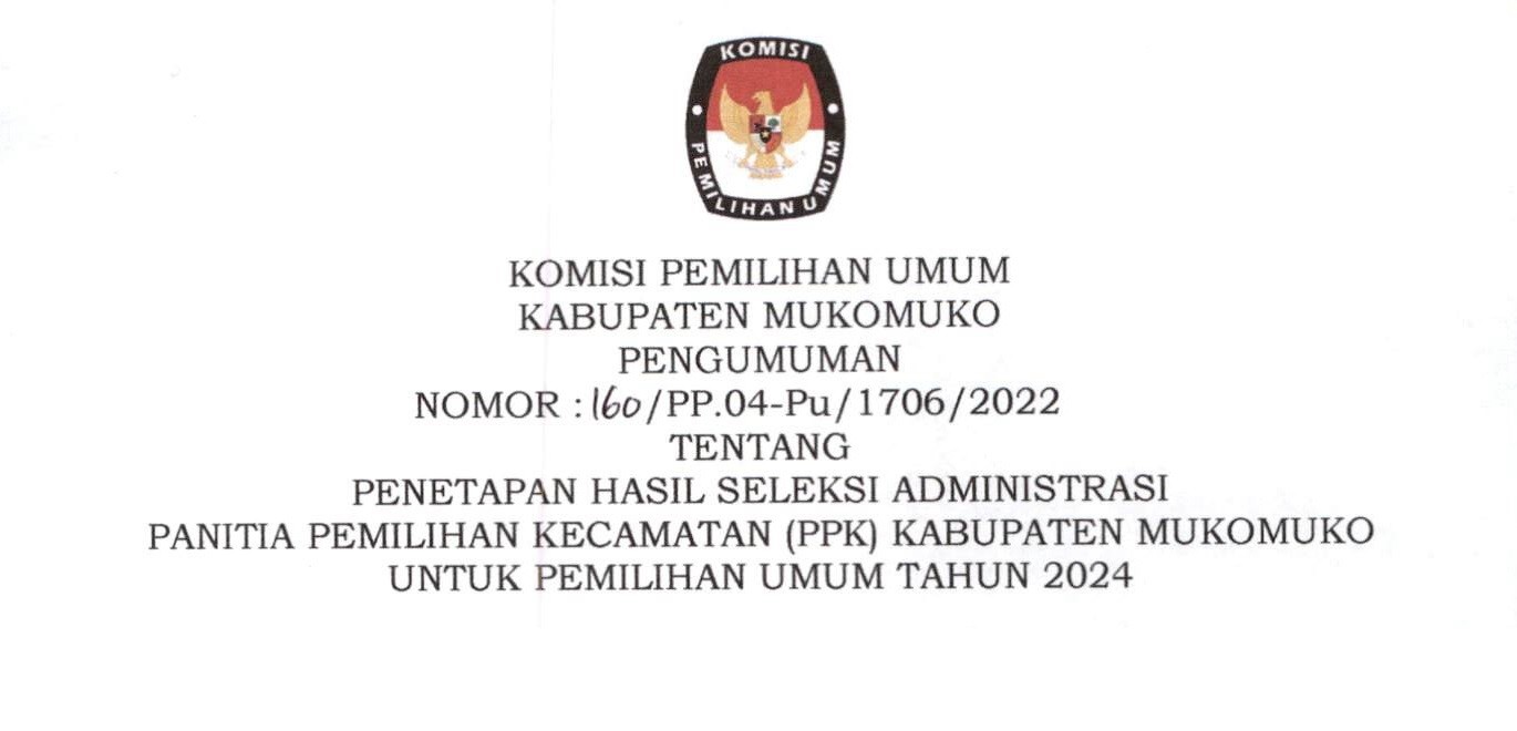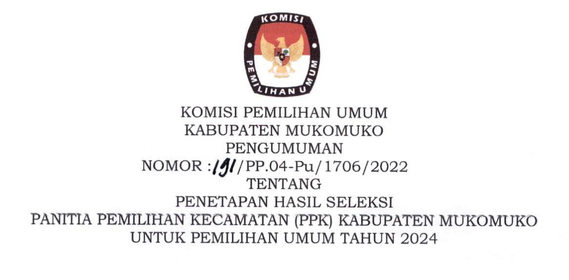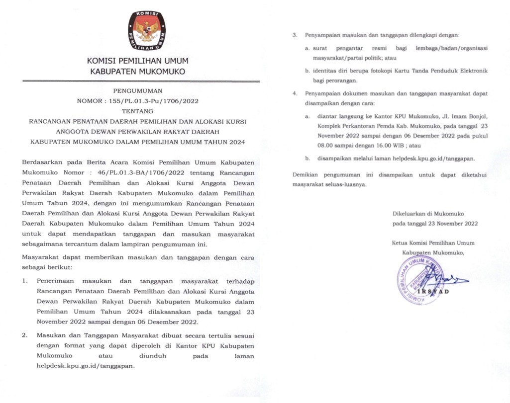 KPU Kab. Mukomuko mengumumkan Rancangan Penataan Daerah Pemilihan dan Alokasi Kursi Anggota Dewan Perwakilan Rakyat Daerah Kabupaten Mukomuko dalam Pemilihan Umum Tahun 2024.