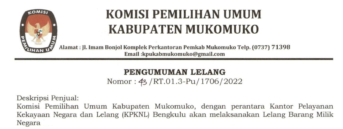 Pengumuman Lelang Barang Milik Negara, berupa Kotak Suara, Bilik suara dan surat suara yang dikelola oleh KPU Kabupaten Mukomuko.