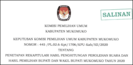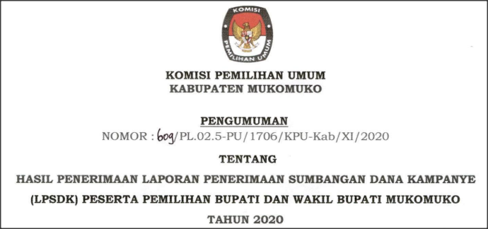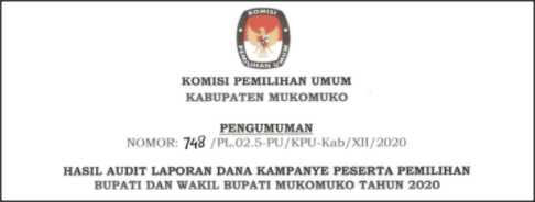 Hasil Penerimaan Laporan Penerimaan Sumbangan Dana Kampanye (LPSDK) Peserta Pemilihan Bupati dan Wakil Bupati Mukomuko Tahun 2020