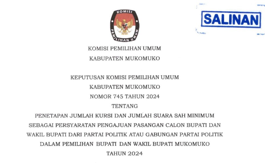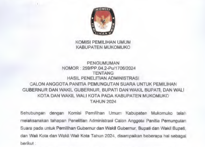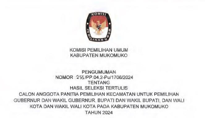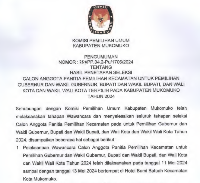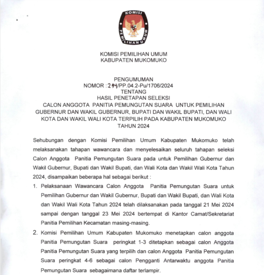 Sehubungan Telah dilaksanakan Seleksi wawancara Calon Anggota PPS di Kabupaten Mukomuko tahun 2024 berdasarkan Tahapan 21 - 23 Mei 2024 bertempat di Kecamatan se-Kabupaten Mukomuko. Maka KPU Kabupaten Mukomuko Mengumumkan Hasil Penetapan Seleksi Calon PPS untuk Pemilihan Gubernur dan Wakil Gubernur, Bupati dan Wakil Bupati, Walikota dan Wakil Walikota pada Kabupaten Mukomuko Tahun 2024 sebagai mana terlamir pada Link dibawah. Sehubungan dengan Hal tersebut, KPU Kabupaten Mukomuko mengundang calon Anggota PPS Terpilih untuk dapat hadir dalam Pelantikan, Pengambilan sumpah/janji, dan Penandatanganan Pakta Intergitas serta Pembekalan Anggota Panitia Pemungutan pada : Hari/tanggal : Minggu, 26 Mei 2024 Pukul : 09.00 wib s.d Selesai Tempat : Halaman Kantor Bupati Mukomuko Pakaian : Atasan Putih dan Bawahan Hitam Kemudian Anggota Panitia Pemilihan Kecamatan WAJIB mengikuti Pembekalan yang akan dilaksanakan pada : Hari/tanggal : Minggu, 26 Mei 2024 Pukul : 13.00 wib s.d Selesai Tempat : Halaman Kantor Bupati Mukomuko Pakaian : Atasan Putih dan Bawahan Hitam Pengumuman Dapat dilihat dan di Download dalam bentuk File Pdf pada Link di Bawah ini: DISINI