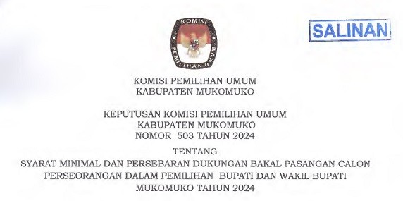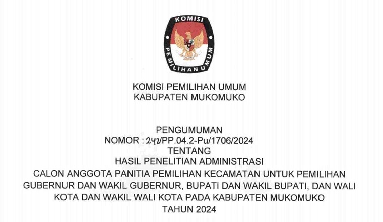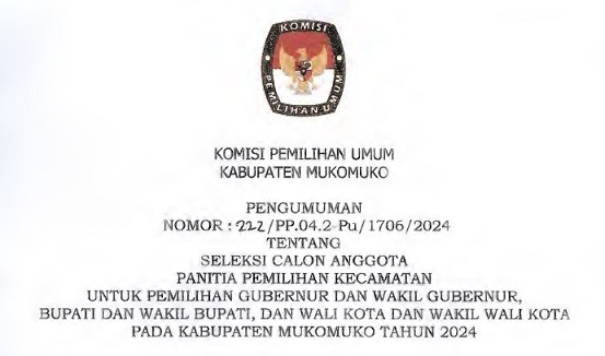 Dalam rangka Pembentukan Calon Anggota PPK Untuk Pemilihan Gubernur Dan Wakil Gubernur, Bupati Dan Wakil Bupati, Dan Wali Kota Dan Wakil Wali Kota Pada Kabupaten Mukomuko Tahun 2024. KPU Kabupaten membuka Seleksi Pendaftaran PPK Untuk Pemilihan Gubernur Dan Wakil Gubernur, Bupati Dan Wakil Bupati, Dan Wali Kota Dan Wakil Wali Kota Pada Kabupaten Mukomuko Tahun 2024.